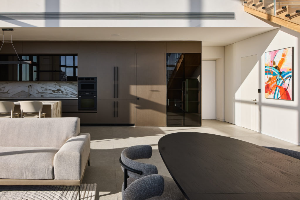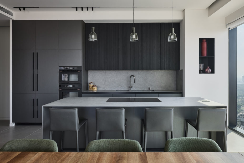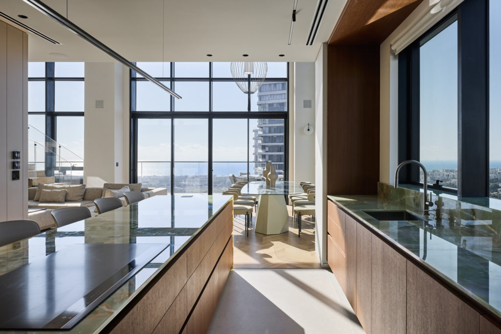 "בכל אחת מהדירות המטבח תוכנן כלב הפונקציונלי והאסתטי של החלל הציבורי. הוא חלק אינטגרלי מהסלון ומהמרחב הציבורי, ותוכנן כך שיתרום לזרימה נכונה, תחושת מרחב ונוחות שימוש יומיומית. בפנטהאוז בפרט, המטבח משמש כציר תכנוני מרכזי שמאזן בין אזור האירוח לבין אזורי המגורים."